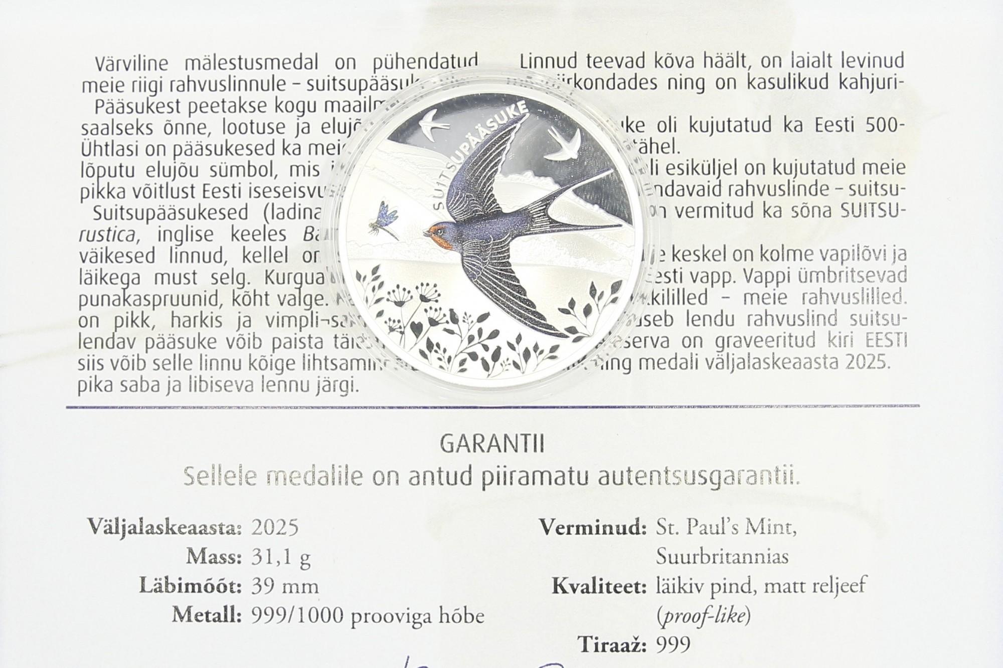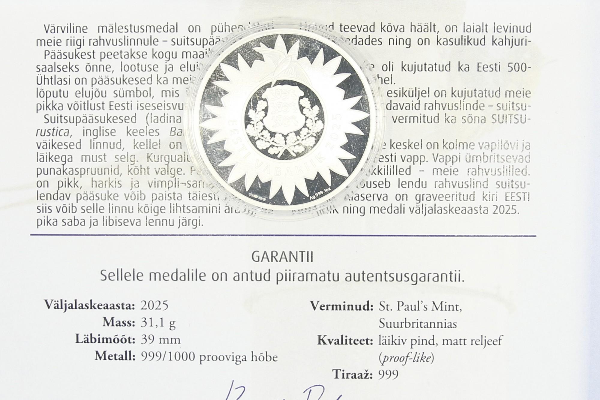 Hõbemedal Suitsupääsuke 999* Hõbemedal Suitsupääsuke 999*Hõbemedal Suitsupääsuke 999*