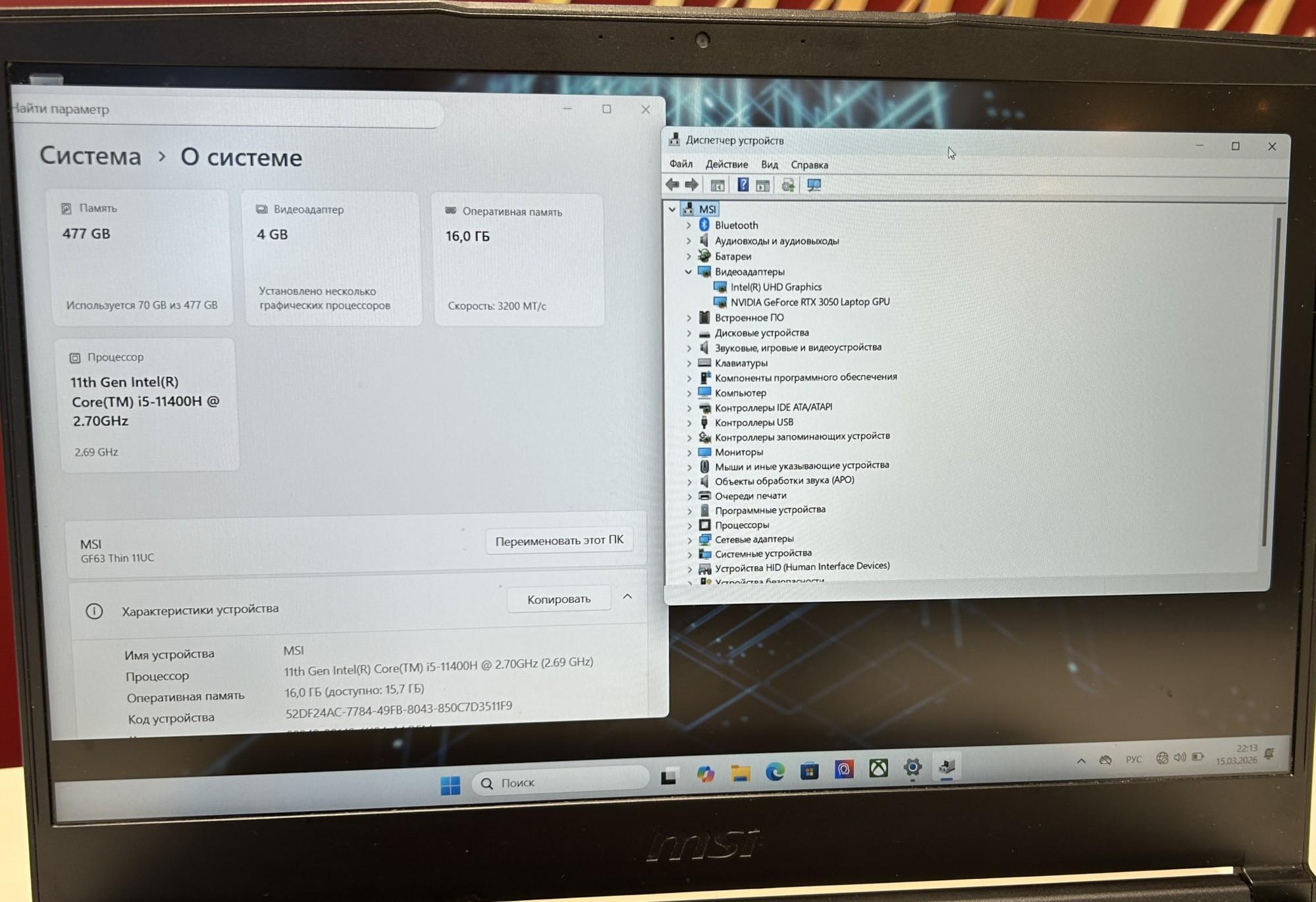 | Graafikakaart | Intel(R) UHD Graphics / NVIDIA GeForce RTX 3050 |